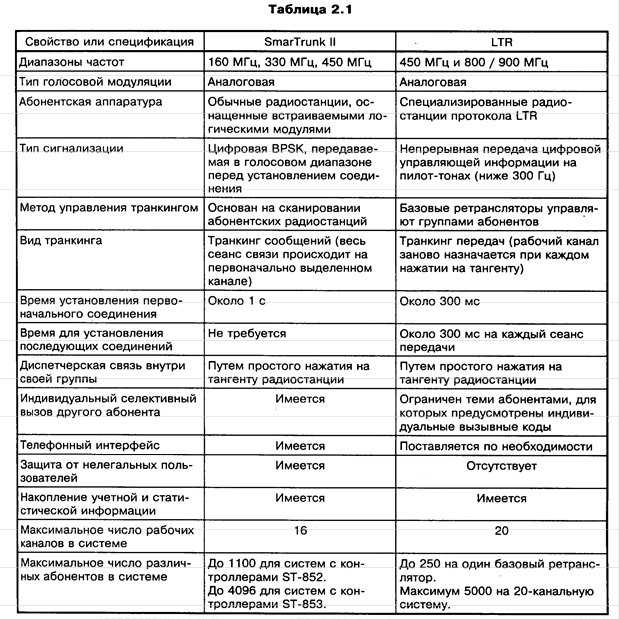 Логика развития систем SmarTrunk наводит на мысль о сравнении их возможностей прежде всего с возможностями транкинговых систем протокола LTR (E.F. Johnson). Приведенная ниже таблица 2.1 была подготовлена фирмой SmarTrunk Systems. Как видно из приведенной таблицы, системы SmarTrunk уверенно развиваются в направлении возможностей LTR. Внедрение общей шины данных в современных базовых станциях SmarTrunk II структурно приблизило их к базовым станциям LTR и создало возможности для дальнейшего расширения функций системы, особенно в плане обеспечения работы в многозоновом варианте, над которым сейчас работают инженеры компании SmarTrunk Systems.