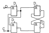 RS – триггер может быть синхронным. В этом случае кроме двух информационных входов S и R триггер имеет еще вход синхронизации. Сигналы на входах S и R лишь подготавливают триггер к нужному переключению, а само переключение происходит только в момент подачи синхронизирующего импульса. Схема такого триггера показана на рис 1.14.4. Синхронизация организуется с помощью двух дополнительных элементов И-НЕ D1 и D2. Элементы D3 и D4 образуют несинхронный (асинхронный) RS – триггер с инверсными входами.