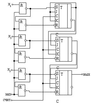 В приведенной схеме JK – триггеры дважды превращены в D – триггеры. Одно превращение осуществлено для организации записи с использованием вспомогательных инверсных входов S и R и, добавлением двух элементов И –НЕ. Этот способ построения триггера показан на рис 1.14.5. Запись числа в регистр в параллельном коде происходит при подаче числа на входы х1, х2, х3 и сигнала «1» на вход «зап». Для считывания информации из регистр в последовательном коде JK – триггеры второй раз превращены в D – триггеры у которых выходы каждого триггера соединены со входом D следующего, как это делается в последовательном регистре. Во втором случае JK – триггеры превращены в D – триггеры способом показанном на рис 1.14.8, но вместо дополнительного инвертора используется инверсный выход предыдущего триггера. Исключение составляет первый триггер, у которого входы J и K объединены и соединены с основным входом этого же триггера. Благодаря такой схеме после подачи импульсов считывания первый триггер оказывается в состоянии «0».