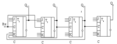 Схема двоичного счетчика с последовательным переносом на JK – триггерах, работающего в коде 8421, показана на рис 1.14.13. Здесь JK – триггеры превращены в Т – триггеры путем подачи «1» на вход J и K .