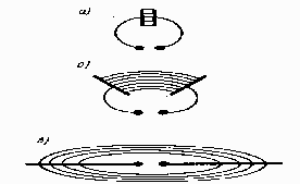 Герц в своих опытах, уменьшая число витков катушки и площадь пластин конденсатора, а, также раздвигая их (рис.1 а, б), совершил переход от закрытого колебательного контура к открытому колебательному контуру (вибратору Герца), представляющему собой два стержня, разделенных искровым промежутком (рис. 1, в). Если в закрытом колебательном контуре переменное электрическое поле сосредоточено внутри конденсатора (рис. 1, с), то в открытом оно заполняет окружающее контур пространство (рис.1,а), что существенно повышает интенсивность электромагнитного излучения. Колебания в такой системе поддерживаются за счет источника э. д. с, подключенного к обкладкам конденсатора, а искровой промежуток применяется для того, чтобы увеличить разность потенциалов, до которой первоначально заряжаются обкладки.