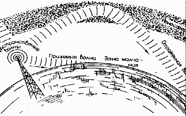 Короткие волны распространяются исключительно посредством отражения ионосферой, поэтому около передатчика существует зона молчания (рис. 3). Короткие волны могут распространяться на большие расстояния при малой мощности передатчика. Например, в подходящее время суток с помощью любительского коротковолнового передатчика мощностью 50 Вт по телеграфному коду можно установить прочную связь меж Болгарией и Австралией. Добавим еще, что днем лучшее прохождение имеют «наиболее короткие» короткие волны (например, 21 и 28 Гц), а ночью лучше распространяются «более длинные» короткие волны (например, 3,5 и 7 МГц). По этой причине любительское КВ передатчики, как правило, работают на нескольких диапазонах, т. е. в зависимости от обстоятельств могут работать на различных частотах, определяемых международной конвенцией для радиолюбительской деятельности.