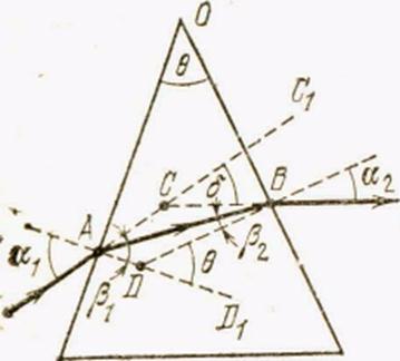 Проходя через призму, луч солнечного света не только преломляется, но и разлагается на различные цвета. Рассмотрим преломление луча в призме. Строго говоря, это означает, что световой луч предполагается здесь одноцветным, или, как принято называть в физике, монохроматическим