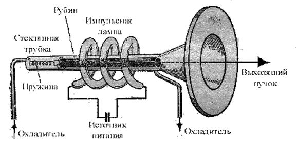 Устройство рубинового лазера. Из кристалла рубина изготовляется стержень с плоскопараллельными торцами. Газоразрядная лампа, имеющая форму спирали (рис. 4), дает сине-зеленый свет. Кратковременный импульс тока от батареи конденсаторов емкостью в несколько тысяч микрофарад вызывает яркую вспышку лампы. Спустя малое время энергетический уровень 2 становится «перенаселенным».