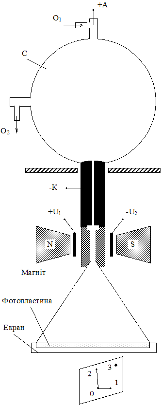 Подивимось, як цим скористався Томсон для визначення маси іонів. Потрібно було одержати пучок позитивних іонів. Для цього він виготовив установку (рис. 1) на якій посудина С через відповідні отвори О1 і О2 заповнюється досліджуваним газом. До електродів А і К прикладено високу напругу ~(3-5)×104 В. Під дією напруги електрони вириваються із атомів і газ в посудині іонізується. Електрони прямують до позитивно зарядженого електрода +А, а позитивні іони - відповідно до негативного електрода -К. В негативному електроді зроблено циліндричний отвір - канал, через який пучок позитивних іонів виводиться в ліву частину установки. Попутно ці іони проходять між зарядженими електродами +U і -U та полюсами магніту, що утворюють магнітне поле (див. рис. 1).