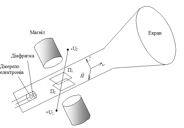 Установка Кауфмана (рис. 3) являє собою вакуумну трубку, з одного краю якої розміщені джерело електронів і діафрагма, а з другого ‑ екран або фотопластинка. Всередині трубки на шляху пучка електронів розміщені відхиляючі пластини П1 і П2, між якими з допомогою електричної батареї створюється різниця потенціалів U1-U2. Там же розміщений постійний магніт М. Таким чином створюються магнітне і електричне поля, які відхиляють електрони.