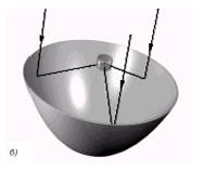 Сфокусировать солнечные лучи можно и с помощью вогнутого зеркала. Оно является основной частью гелиоконцентратора, прибора, в котором параллельные солнечные лучи собираются с помощью вогнутого зеркала. Если в фокус зеркала поместить трубу с водой, то она нагреется. Таков принцип действия солнечных преобразователей прямого действия.