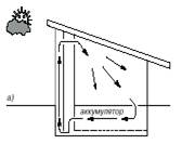 Плоский коллектор, помимо прямой солнечной радиации, воспринимает рассеянную и отраженную радиацию: в пасмурную погоду, при легкой облачности, словом, в тех условиях, какие мы реально имеем в средней полосе. Плоский коллектор не создает высокопотенциальной теплоты, как концентрирующий коллектор, но для конвекционного отопления этого и не требуется, здесь достаточно иметь низкопотенциальную теплоту. Солнечный коллектор располагается на фасаде, ориентированном на юг (допустимо отклонение до 30° на восток или на запад).