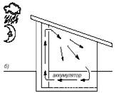 Неравномерность солнечной радиации в течение дня, а также желание обогревать дом ночью и в пасмурный день диктует необходимость устройства теплового аккумулятора. Днем он накапливает тепловую энергию, а ночью отдает. Для работы с воздушным коллектором наиболее рациональным считается гравийно-галечный аккумулятор. Он дешев, прост в строительстве. Гравийную засыпку можно разместить в теплоизолированной заглубленной цокольной части дома. Теплый воздух нагнетается в аккумулятор с помощью вентилятора.