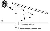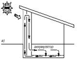 Водонагреватель. Водонагреватель предназначен для снабжения горячей водой, в основном, индивидуальных хозяйств. Устройство состоит из короба со змеевиком, бака холодной воды, бака-аккумулятора и труб. Короб стационарно устанавливается под углом 30-50° с ориентацией на южную сторону. Холодная, более тяжелая, вода постоянно поступает в нижнюю часть короба, там она нагревается и, вытесненная холодной водой, поступает в бак-аккумулятор. Она может быть использована для отопления, для душа либо для других бытовых нужд.