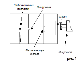 При хорошем вакууме внутри прибора в отсутствие фольги на экране возникала полоска света, состоящая из сцинтилляций, вызванных тонким пучком α – частиц. Но когда на пути пучка помещалась фольга, α – частицы из-за рассеяния распределялись на большей площади экрана.