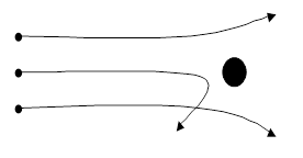 И в правду, это не вероятно, дело в том, что проводя этот опыт на меньших углах, то а - частица обязательно отскочит в сторону, подобно тому как камушек несколько десятков граммов при столкновении с автомобилем не в состоянии заметно изменить его скорость (рис. 5). Так как их масса примерно в 8000 раз больше массы электрона, а положительный заряд равен по модулю удвоенному заряду электрона. Это не что иное, как полностью ионизированные атомы гелия. Скорость α – частиц очень велика: она составляет 1/15 скорости света. Следовательно, электроны вследствие своей малой массы не могут заметно изменить траекторию α – частицы.