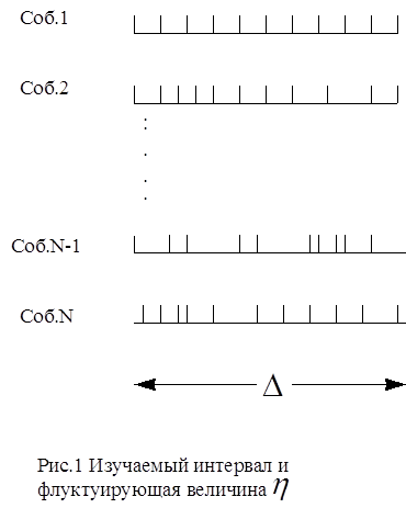 Пусть у нас имеется N событий в которых исследуемая величина (h) сильно флуктуирует (Рис.1). Этот процесс может быть описан путем деления соответствующего интервала D на M (для определенности) интервалов величиной