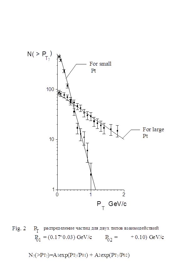 Интегральное распределение поперечных импульсов всех вторичных g - квантов дано на рис.2. Как видно из рисунка это распределение ясно состоит из двух экспонент: