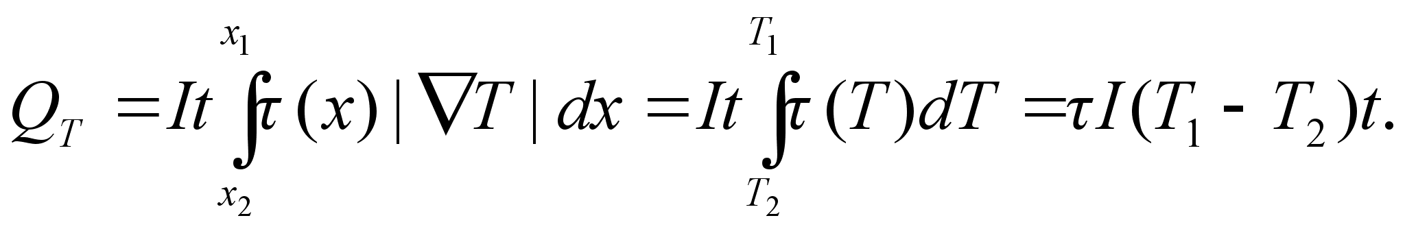 Эффект Томсона (Кельвина) . Эффект Томсона относится к объемным (линейным) эффектам в отличие от плоскостного (точечного) эффекта Пельтье. при протекании тока I по термически неоднородному полупроводнику (или проводнику) на его отрезке (х1,х2) с перепадом DТ1-Т2№0 в случае совпадения направлений тока и градиента ![]()