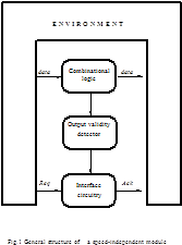 In speed-independent circuits transition duration can be arbitrary. So a centralized clock cannot be used. Instead special circuitry to detect output validity is applied. Besides, additional interface circuitry is needed to communicate with the environment in a handshaking manner. A speed-independent circuit can be seen as a module consisting of combinational logic (CL) proper, CL output validity detector (OVD) and interface circuitry (Fig.1). To enable OVD to distinguish valid output data from invalid ones, the redundant coding scheme was proposed (2). The main idea of the scheme is to enumerate all possible input and output data, both valid and invalid. The OVD must be provided with appropriate information on data validity. To realize the idea of redundant coding some constraints on CL design are imposed (3):