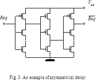 In this example we use a simplified asymmetrical delay implemented as an asymmetrical CMOS inverter chain (Fig.3). Contrary to the common inverter an asymmetrical one has non-equal rise and fall times of output signal.