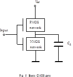 Current consumption by CMOS CL contains useful information on CL state. CMOS CL is a network of CMOS gates, so the current consumed by CL is a superposition of currents consumed by CMOS gates included in the CL. Each CMOS gate contains PMOS transistor and NMOS transistor networks (Fig.5). While a gate is in a steady state either the PMOS or the NMOS network is in a conducting mode. When a gate switches the non-conducting transistor network becomes conducting. There is usually a short period in switching time when both networks are in a conducting mode.