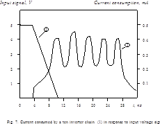 In Section 2 we presented series-parallel model of computations in CL. We showed that in every moment during switching current consumed by CL is a superposition of the currents consumed on the activated signal propagation paths (SPPs). Now, considering CL implemented by CMOS devices we should note that while logical signal propagates through SPP the neighbouring gates switch in opposite directions. That is why a curve of current consumed by a ten inverter chain (Fig.8) looks like a combination of crests and troughs. Nevertheless, in the very lowest point of the curve the current consumed by CL in a transient state remains several orders more than in a steady state.