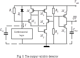 The OVD circuit contains a current-to-voltage converter (CVC) consisting of the resistor R1 and the diode D1. The OVD also contains a comparator implemented by the MOS transistors M1-M7 and resistors R2,,,R3 . CMOS CL consumes the current I and introduces a capacitance Cin . The capacitance Cout represents the load caused by the interface circuitry. A low potential output signal of OVD corresponds to CL output validity. A high potential output signal corresponds to CL output invalidity. So, OVD generates OV signal in negative logic manner.