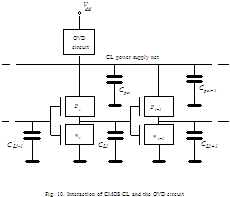Consider a piece of CMOS CL and its interaction with OVD circuit (Fig.11). The piece is an SPP including N logic gates. Each gate is shown symbolically as a connection of PMOS and NMOS networks. All the capacitances affecting ton and toff can be brought down to three components: