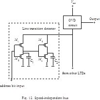 The CMOS transition detector was invented in 1986 (15). This circuit is also based on double-rail coding and uses a pair of series-connected NMOS transistors (Fig.12). The scheme for -bit bus control contains line transition detectors (LTDs) and AND-gates. Outputs of AND-gates are united in node M forming wired OR. The output inverter serves as a pulse shaper. Capacitors C1 and C2 are intended to prolong rise time of the LTD output signal (true and complementary). This is necessary for reliable detection.
