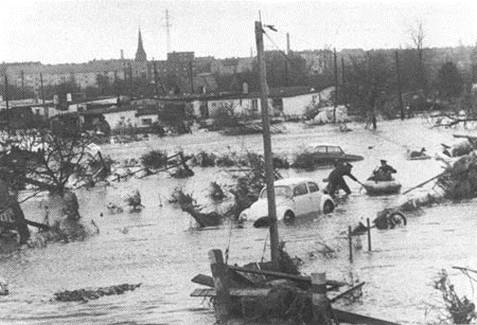 Спустя девять лет подобная катастрофа произошла в Германии. В ночь с 16 на 17 февраля 1962 г. два независимых друг от друга явления привели к ужасным последствиям: ураганный ветер силой в 11 - 12 баллов гнал на берег воды Северного моря, а на Эльбе в это же время началось наводнение.