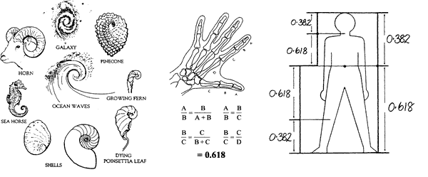 Например, число 0.618 представляет собой постоянный коэффициент в так называемом золотом сечении (рис.1), где любой отрезок делится таким образом, что соотношение между его меньшей и большей частью равно соотношению между большей частью и всем отрезком. Таким образом, число 0.618 известно еще как золотой коэффициент или золотая середина. Такого типа пропорцию можно встретить абсолютно везде (рис.2).