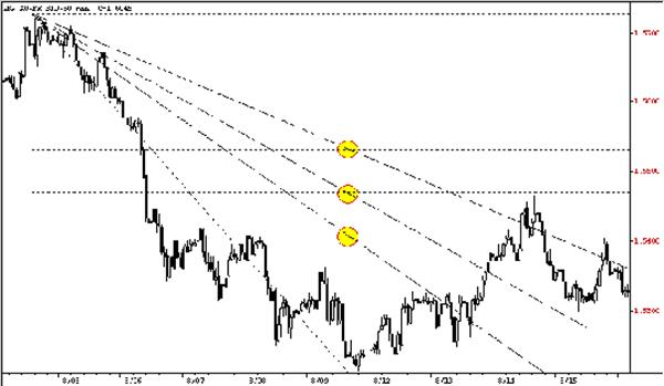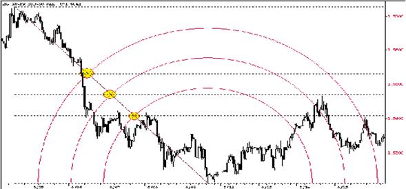 Для того, чтобы получить представление не только об уровнях, но и времени возникновения тех или иных ценовых движений, дуги обычно используют вместе с веерными или скоростными линиями (рис.5). принцип их построения похож на описанный только что.