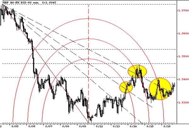 Выбираемые при этой коэффициенты имеют значения 38.2%, 50%, 61.8%. В соответствии со своим расположением дуги будут играть роль сопротивления или поддержки.