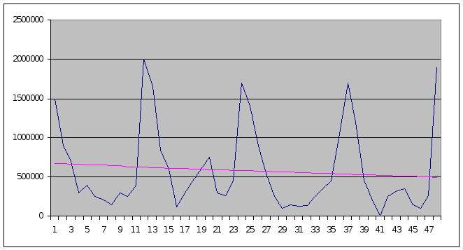 Из результатов анализа видно, что критерии серий и инверсий дают противоречивые результаты проверки наличия тренда. Следует учитывать, что критерий инверсий является более мощным для выявления линейного тренда, однако для выявления флуктуации предпочтение следует отдать критерию инверсий. Из вышесказанного можно предположить, что в выборке присутствует тренд, не являющийся, однако линейным, а скорее выраженный в виде флуктуации. Последующие исследования подтверждают данное предположение, что явно видно из графика представленного в приложении А.