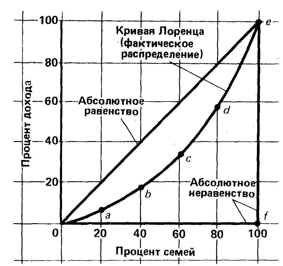 Абсолютное неравенство означает, что и 20%, и 40%, и 60%, и т.д. населения не получают никакого дохода, за исключением одного единственного, последнего в ряду (линия OF) человека, который присваивает 100% всего дохода. Ломаная линия ОЕ – это линия абсолютного неравенства.