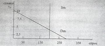Рис.3. Общий спрос на деньги. Равновесная ставка процента. Dm – это общий спрос на деньги. Линию Dm получаем путем перемещения вправо линии D2 на величину спроса на D для сделок, то есть на 100. Пересечение спроса и предложения денег дает картину денежного рынка и определяет равновесную ставку процента.