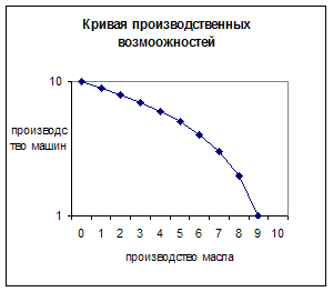 Производственные возможности общества – это максимально возможный объем производства благ при полном и эффективном использовании имеющихся ресурсов. Эффективность производства – это отношение полученного результата к ресурсам, затратам. Возрастающие потребности общества ориентируют на постоянное увеличение результата. Но, поскольку ресурсы ограничены, то ограничены и производственные возможности. Увеличение объемов производства одного продукта может быть достигнуто лишь при частичном или полном отказе от производства другого. Ограниченность ресурсов определяет их альтернативное использование. Поскольку ресурсы редки, экономика полной занятости, полного объема производства не может обеспечить неограниченный выпуск товаров и услуг. Более того, следует принимать решения, какие товары и услуги следует производить, а от каких отказаться. Ограниченность ресурсов означает ограниченность и выпуска. Поскольку ресурсы ограничены и применяются целиком, всякое увеличение производства в одном, к примеру производство машин, потребует переключение части ресурсов с производства другого, к примеру масла. И противоположный вывод- если необходимо увеличить производство масла, то необходимые ресурсы должны быть получены лишь за счет сокращения производства машин. Общество не может преследовать две взаимоисключающие цели при полной занятости ресурсов.
