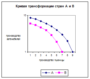 Кривая трансформации может иллюстрировать и различия, существующие в области производственных возможностей разных стран. Так, на рисунке 2 изображены кривые трансформации стран А и В.