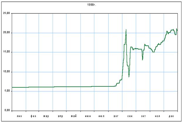 17. 7 Сентября - ассоциация российских банков потребовала смены руководства ЦБ РФ. Председатель ЦБ РФ Сергей Дубинин направил президенту Ельцину письмо с прошением об отставке. И.о. председателя ЦБ РФ стал первый заместитель Дубинина - Сергей Алексашенко. 7 Сентября курс рубля по отношению к доллару США – 16,99 руб. за 1 дол.