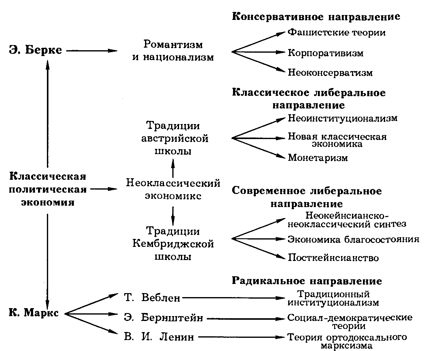 Институционализм. Обострение внутренних противоречий рыночной экономики способствовало зарождению институционально-социологического направления. Его истоки восходят к идеям исторической школы в Германии (Ф. Лист, К. Книс, Б. Гильденбрандт, В. Рошер, Г. Шмолер, В. Зомбарт, М. Вебер). Новая историческая школа критиковала экономистов (марксистов, маржиналистов и др.) за чрезмерное увлечение голыми абстракциями, пропагандируя необходимость эмпирических исследований, основанных на богатом историческом материале. Представители исторической школы определяли национальную (политическую) экономию как науку о повседневной деловой жизнедеятельности людей, извлечении ими средств существования и их использовании.