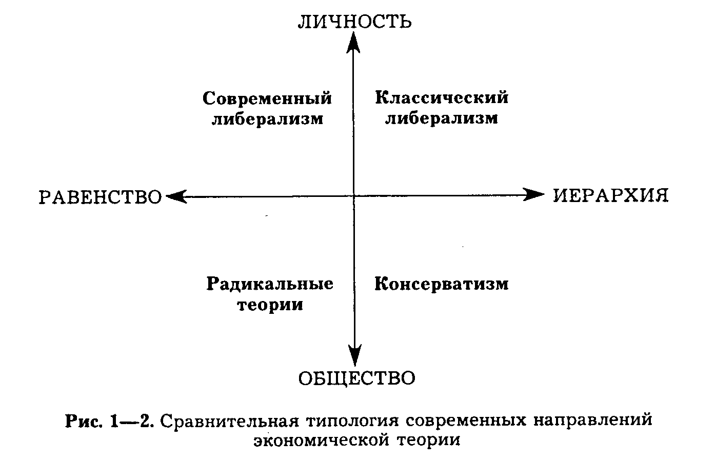 Классификация современных экономических теорий. Палитру современных подходов хорошо отражает классификация, предложенная Б. Кларком (см. рис. 1.2). Она позволяет не только отразить многообразие современных подходов, но и отметить точки их соприкосновения и взаимного перехода: от консервативного направления — через классический и современный либерализм — к радикальным течениям.