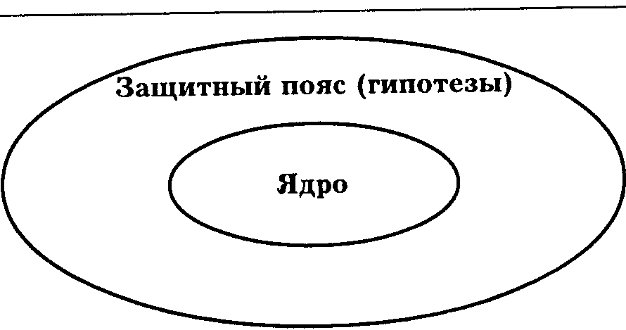 Ядро — наиболее фундаментальные положения теории; защитный пояс образуют вспомогательные гипотезы, которые конкретизируют теорию, расширяя область ее применения. Доказанные гипотезы сливаются с ядром, недоказанные служат объектом полемики с оппонентами, защищая ядро теории. Например, ядром марксизма являются трудовая теория стоимости, теория прибавочной стоимости, всеобщий закон капиталистического накопления, а их защитным поясом — закон тенденции нормы прибыли к понижению и другие законы.