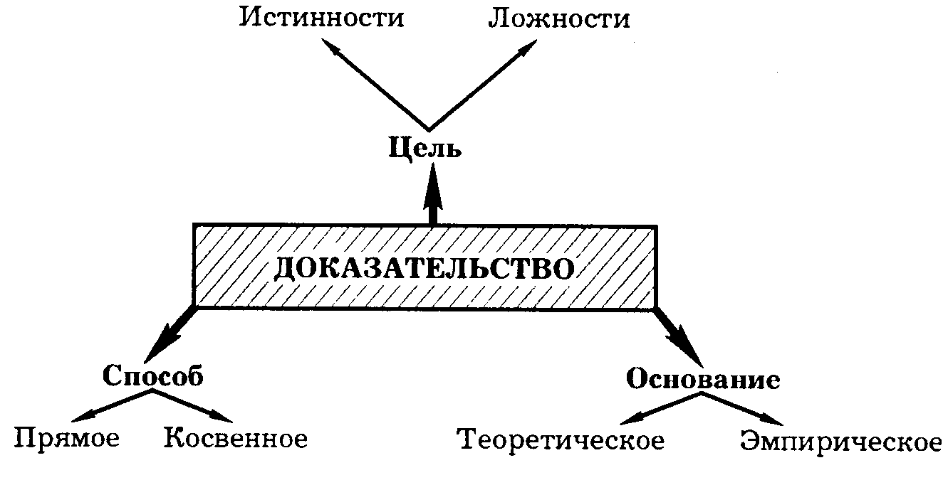 Под доказательством в формальной логике понимается обоснование истинности одной мысли с помощью других. Формальная логика предлагает универсальную структуру доказательства. Она состоит из тезиса, оснований доказательства (аргументов) и способа доказательства (демонстрации). Существуют различные виды доказательства. В зависимости от его целей выделяют доказательства истинности и ложности (опровержение); в зависимости от способа доказательства — прямые и косвенные; в зависимости от оснований доказательства — теоретические и эмпирические (см. рис. 1.5).