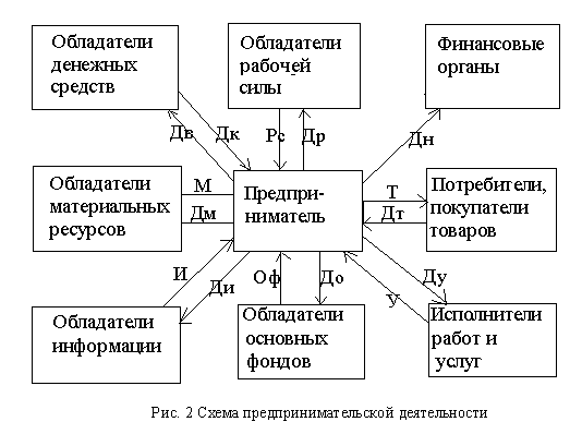 В большинстве видов предпринимательства для выполнения предпринимательской операции нужны материальные ресурсы в виде сырья, материалов, энергии, готовых товаров. Приобретая недостающие материальные ресурсы М и у их обладателей, предприниматель уплачивает им денежные средства Дм, то есть получает материалы в обмен на деньги. Иногда материальные ресурсы приобретаются путем бартерного обмена. При коммерческом предпринимательстве приобретенные материальные ресурсы могут быть в виде готового товара. Третий важнейший вид необходимых для предпринимательства факторов, средств представляют основные фонды в виде зданий, сооружений, помещений , машин, оборудования, аппаратуры, вычислительной и организационной техники . Отсутствующие у предпринимателя основные фонды Оф приходится приобретать, арендовать у их обладателей за деньги До. Для проведения большинства предпринимательских операций нужна информация в виде сведений, данных, чертежей, технологий, проектов, знаний, документов. Информация в наше время тоже стоит денег. Чтобы получить недостающую информацию И, предприниматель должен заплатить за нее деньги Ди. Наряду с упомянутыми факторами предпринимателю могут понадобится работы и услуги, которые он не способен выполнить собственными силами. За предоставление услуг У надо уплатить деньги Ду. Проводя предпринимательскую операцию, предприниматель затрачивает и собственные ресурсы в виде своей рабочей силы, материалов, денежных средств, информации. Это внутренние затраты, но и они стоят денег, общая сумма которых равна Двн. Кроме всех указанных ресурсов и форм их получения предпринимателю зачастую приходится прибегать к приобретению отдельных ресурсов в долг, в виде займа. Ведь ему нужны ресурсы, средства еще до того, как они будут возмещены, окуплены в результате продажи товаров и получения денежной выручки Дт. Следовательно предпринимателю необходим начальный капитал. Если такого капитала нет, то приходится его заимствовать. Заимствование может иметь место в натуральной, вещественной и денежной формах. Предоставление предпринимателю материальных средств предпринимательской деятельности в виде зданий, помещений, оборудования, машин, других видов материальных ресурсов на определенное время и на условиях внесения платы называют арендой. Иногда договор аренды заключается с правом последующего выкупа арендатором арендуемого имущества. Чаще заимствование происходит в форме получения денежного кредита у обладателей денежных средств, скажем в банке. Получив кредит, затем придется его вернуть в сумме Дв, превышающей Дк, то есть уплатить проценты за ссуду Дс. Очевидно что