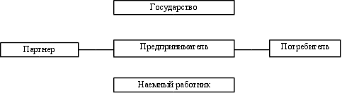 Основным субъектом предпринимательской активности выступает предприниматель. Однако предприниматель — не единственный субъект, в любом случае он вынужден взаимодействовать с потребителем как основным его контрагентом, а также с государством, которое в различных ситуациях может выступать в качестве помощника или противника. И потребитель и государство также относятся к категории субъектов предпринимательской активности, как и наемный работник (если, конечно, предприниматель работает не в одиночку), и партнеры по бизнесу (если производство не носит изолированного от общественных связей характера) (рис. 2).