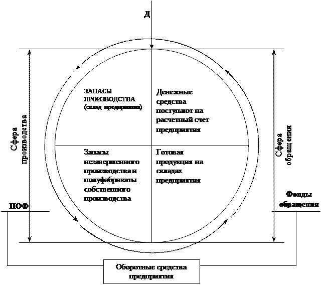 Оборотные средства предприятия в каждый момент времени пребывают на всех стадиях кругооборота, то есть часть средств появляется на предприятии в виде запасов производства, другая их часть находится в виде незавершённого производства полуфабрикатов, третья часть в виде готовой продукции, которая постепенно превращается в денежные средства на расчётном счёте предприятия.