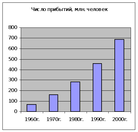 С 60-x годов ХХ века международный туризм начал бурно развиваться. В это время феномен туризма приобретает широкий размах, с числом международных туристических посещений, превышающих 50 млн., а после 60-70-х годов, для которых характерен массовый туризм на мировом уровне, рост международного туризма приобретает захватывающие темпы (Таблица 1.3).