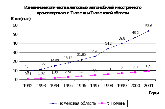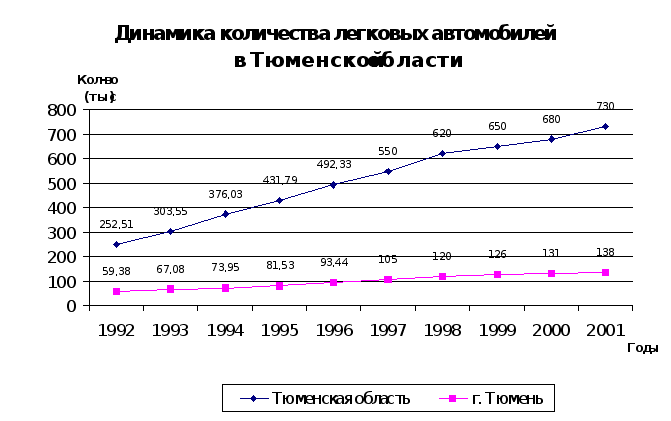 Средний годовой прирост легковых автомобилей за последние 5 лет (1994-1998 г.г.) составляет по области - 56.900 автомобилей, по г. Тюмени - 6.150 автомобилей.