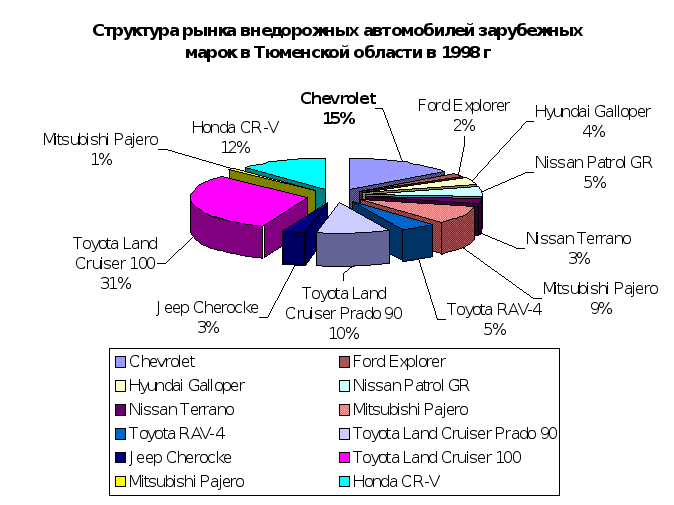 Как видно из рис. 2.3., основную массу составляют автомобили японского производства (76%), американские автомобили занимают 1/5 часть рынка внедорожников, что составляет 20 % из них 15 % - автомобили марки Chevrolet.