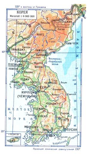 Южная Корея. Площадь 93,6 тыс. км. кв. Hаселение свыше 42 млн. человек. 9 административных единиц - провинций, города Сеул и Пусан выделены в отдельные административные единицы. Главный город - Сеул. С запада полуостров омывается Желтым морем, с востока Японским морем, с юга Корейским проливом и проливом Чеджу. Основная часть Кореи занята горами; на Западе - холмистые равнины. Восточный берег крутой, слабо расчленен; на Западе и Юге - сильно изрезан. Климат муссонный; осадков 900-1500 мм в год. Реки многоводны, преимущественно горные, с летним максимумом расхода. Почвы в большей части горно-лесные бурые, на юге – красноземы и желтоземы. Смешанные широколиственные и (на Юге) вечнозеленые субтропические леса. Равнины возделаны (рис, соя, хлопчатник). В животном мире сочетаются таежные, тропические и субтропические виды. Месторождения вольфрама, графита, магнезита. К северу климат более умеренный, четко разграничиваются все четыре времени года. Основное население составляют корейцы (не менее 98%), много китайцев. Плотность населения на равнинах – 200 – 250, в горных районах – до 30 человек на 1 кв. км. Официальный язык — корейский, религия — буддизм, конфуцианство и христианство, денежная единица — вона РК.