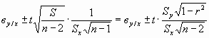 Аналогичен подход по оценке параметров прямой регрессии x на у. Доверительные оценки параметров прямой регрессии у на х (аналогично х на у) выполняются с использованием суммы квадратов отклонений измеренных значений yi от рассчитанных по уравнению прямой регрессии. Принято, что все ошибки измерения независимы и следуют нормальному закону распределения около нуля с дисперсией s 2. Для теоретической прямой регрессии y =` y – ву/х (х-` х) доверительными границами для ` у служат: