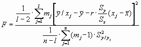Если F превосходит критическое табличное значение при числах степеней свобода K1=l-2; K2=n-l надежностью P гипотезу о линейном характере усредненной зависимости y от x следует поставить под сомнение (70, 76, 80).