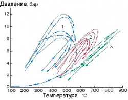 Зональные минералы распространены во всех метаморфических породах (1, 4). Более того, каждой зоне крупного минерала в том же прослое породы соответствует несколько очень мелких гомогенных зернышек данного минерала. Это значит: что практически каждый образец несет информацию о закономерном изменении P и T. Для многих глубокометаморфизованных комплексов корреляция между PT-параметрами оказалась линейной: P, кбар = 0.02( 3.7*10-3)T 0С + 6.8( 2.5) (3). Это доказывает сопряженность их изменения за теологически короткий промежуток времени. К этому мы еще вернемся. Заметим лишь, что с помощью геологических термометров и барометров удалось вывести РТ -тренды для большого числа метаморфических комплексов нашей планеты. По условиям геологического залегания и метаморфической эволюции они четко подразделяются на три большие группы.